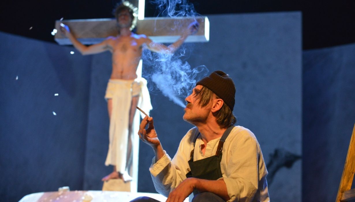 At the fork in the road, there's a cross. The moon only shines on it after the carpentry apprentices, have managed to raise it. But when they leave the scene to bring the paint for the statue of the Messiah, Christ exchanges his place with a thirty-three-year old who strangles his bossy mother in front of his eyes, and then lays his hand on himself.