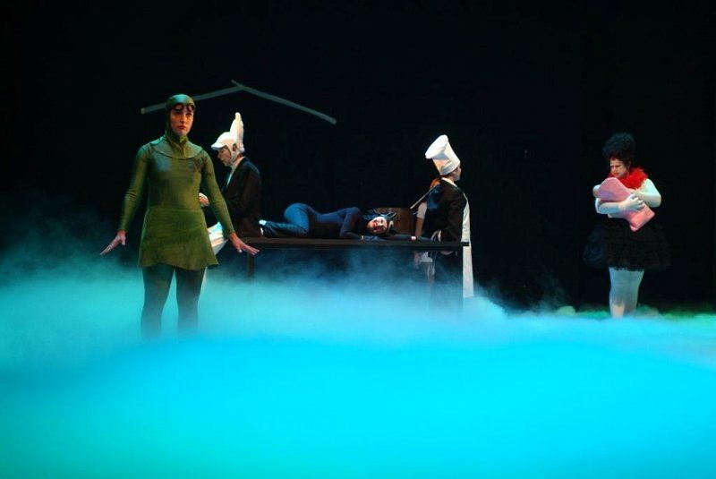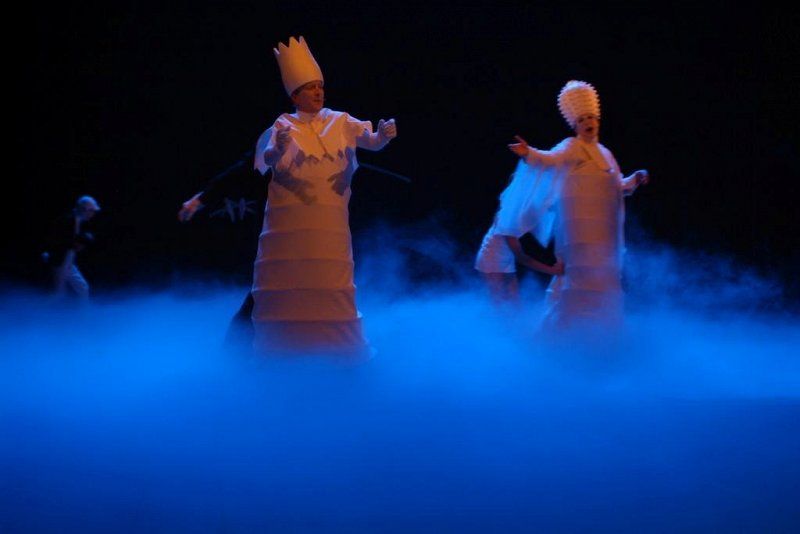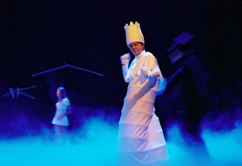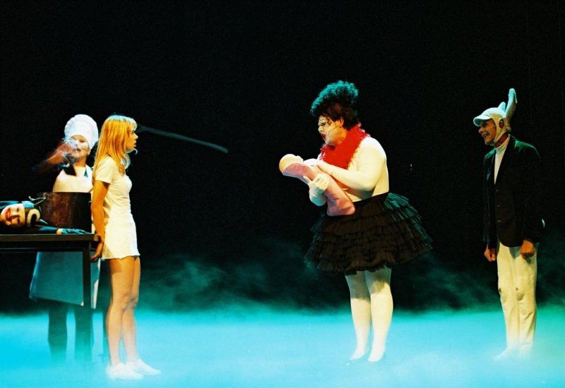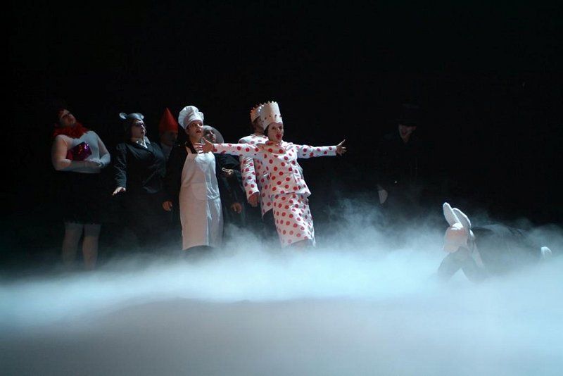 Nikakršnega spogledovanja z mitičnim Disneyjevim filmom, tudi barve niso nič kaj kričeče: uprizoritev prej hoče gledalca dezorientirati, zamajati njegove predstave o samoumevnosti sveta, v katerem živi. Pesmi so lahkotne, a s premišljeno uporabo besednih iger, včasih napisane v izmišljenem, onomatopoetičnem jeziku, v katerem prej ali kasneje spregovorijo vse osebe.