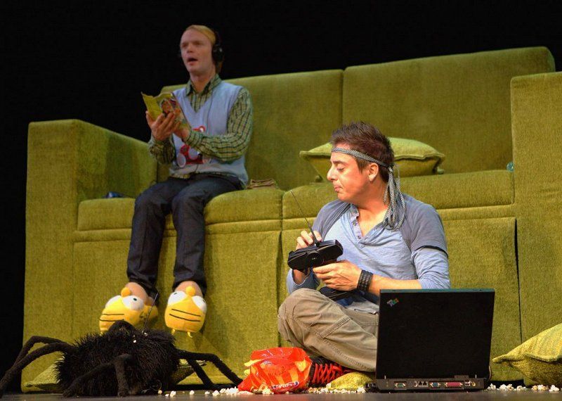 Dogajalni okvir njegovih pustolovščin je po proznih izdajah Francesce Simon priredila Tamara Matevc, uprizoritveno verzijo je zasnovala Tatjana Doma, režija Jaše Jamnika pa je v hudomušni, mestoma tudi »nekorektni«, predvsem pa dinamični postavitvi vase posrkala kar najvišjo mero pozornosti. S scenografskega vidika (Vasilija Fišer) se uprizoritev izmika prisiljenemu realizmu in kot taka ne stavi na utečeno prostorsko logiko, temveč se z njo poigrava in ji v skladu s celotno vsebinsko naravo Groznega Gašperja premika meje »dovoljenega«. Megalomanski dvosed, zasidran v središče dogajalnega prepiha, je osnovan kot scenski epicenter, ki po eni strani vzbuja občutek nadrealizma slikanic, po drugi pa funkcionalno in večnamensko služi za občutek domačnosti ter izrabi za otroške igre in »skrivalnice« – prav slednje koristi nenadnim izginotjem likov, kar včasih zapelje v odrsko fantastičnost, predvsem pa v mizanscensko pretočnost. Druščina treh prijateljev, Groznega Gašperja (Igor Štamulak) in njegovega značajsko inverznega brata Pridnega Petra (Rok Matek) ter Muhaste Maje (Medea Novak), v situacije stopa z že izoblikovanimi predhodnimi odnosi; dan, ki ga spremljamo, je le še eden v nizu krotenja malopridnežev, ki ga nikakor ne more opraviti karikirano histerična in arahnofobična varuška Rebeka (Blaž Valič). V prepletu neprestanega draženja s simulirano tarantelo, z igranimi hipnozami, »nastopaškimi« songi (Mirko Vuksanović) in s subtilno izpeljanimi pripovedmi grozljivk (te v predstavo vnašajo še dodatno, nadvse učinkovito dimenzijo doživljanja), se sestavlja slika, polna navzkrižnih značajev. Ali je bolje biti ubogljivo učen ali poredno raziskovalen, je le ena od zanimivih dilem, ki jih podaja uprizoritev. Odločitev je prepuščena otrokom, sicer pa enoznačnega odgovora ni.