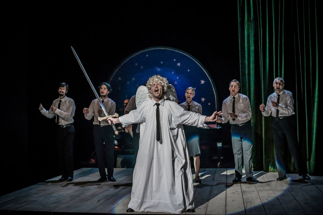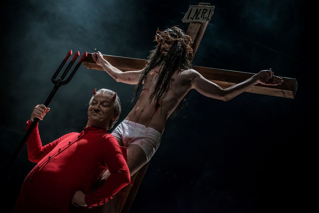 Izvirnost Pašjona je predvsem v izrabi interpretacijsko praznih mest glede Kristusovega življenja v Svetem pismu. Mlakar jih napolni s tematizacijo in s parodijo, z zbadljivim humorjem in ironijo. Ob prihodu svetih treh kraljev v Betlehem se tako pomudi pri rasizmu, ob prizorih o narodni eliti pri slovensko specifični vrlini klečeplazenja, ob zadnji večerji pozornost nameni predvsem ženskam, ki pripravljajo obed. Vse omenjeno ob obilici duhovitih zapletov in intrig. Hudič ima, skratka, dušo, pravzaprav je boljši od ljudi, je sklep Pašjona, ki sedmim smrtnim grehom doda še enega, poglavitnega: neumnost. Izvedbeno se zdi, kot bi Iztok Mlakar pisal vloge za dano zasedbo. Žiga Udir je stoičen, a v posameznih trenutkih vendarle temperamenten Jezus, Mlakar kot osrednja hudičevska figura je rahlo vražji, a večinoma prikupen, torej dobri, ob tem pa še modri hudič. Izreden igralski komedijski par sta Igor Štamulak in Gorazd Žilavec (slednji tudi kinetično eksploziven) kot Farizej in Saducej. Poleg Matije Rupla kot Jude Iškarijota, Tjaše Hrovat (Magdalena) in Radoša Bolčine v dveh izvrstnih komičnih vlogah (Boltežar, Ivana) in ganljivi upodobitvi Jožefa, v vlogah Angela, Matere, Slepca in Suzane nastopi še – v vseh naštetih enako prepričljiv – Rok Matek, ki iz vloge v vlogo proizvaja vrhunske, enkratne komične učinke.
