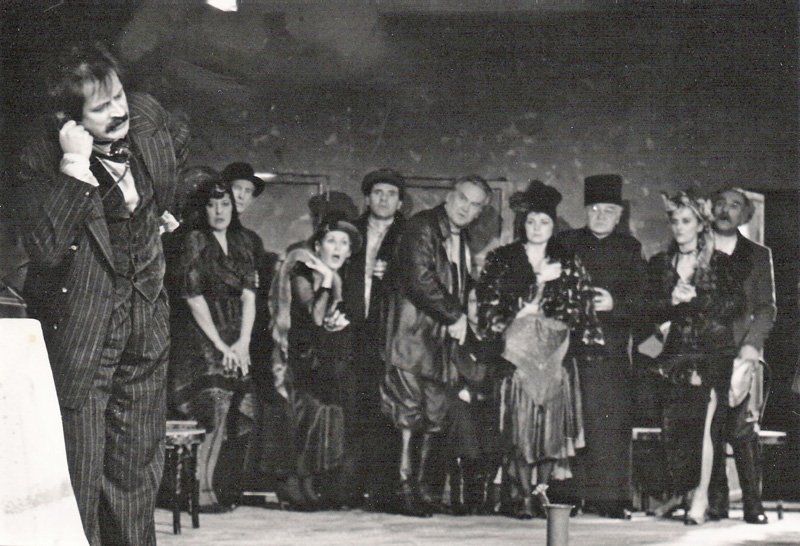 Novogoriški igralski ansambel je okrepljen s številnimi gosti zavzeto in angažirano sledil aktualni, gledališko radoživi in spektakularni odrski interpretaciji. Poleg skladne ansambelske igre, zlasti učinkovite v množičnih prizorih, so igralci svoje komedijske like tudi razvidno individualizirali v mestoma burkaške, mestoma groteskne figure. Naslovno vlogo Semjona Podsekalnikova je komedijantsko radoživo in prepričljivo ustvaril Janez Starina, ki je svoj lik razvijal od naivnega pritlikavega, nemočnega, brezposelnega delavca in socialno odvisnega družinskega »poglavarja« ter cirkusantskega muzikanta, preko notranje osvobojenega in samozavestnega razpolagalca z lastnim življenjem in smrtjo, do končnega spoznanja resnice človeka in družbe. Hrupno burkaštvo je poglabljal v smeri globlje občutljivosti za paradoksalnost in absurdnost človekove eksistence, burleskno naivnost je mehčal in bogatil z vse jasnovidnejšo ostroumnostjo in odrezavostjo, z odprtostjo lastne eksistence za pekel in nebo slehernikovega življenja. Njegovo trpno, a tudi prikrito oblastniško ženo Marijo je s poudarjeno krhkostjo izoblikovala Teja Glažarjeva, zdravorazumsko odrezavo in življenjsko izkušeno mater Serafimo pa Marjanca Krošlova. Pološčenega samozavestnega predstavnika ruske inteligence, ki s patetičnimi puhlicami parazitsko izkorišča tujo akcijo in usodo, je oblikoval Jože Hrovat, njemu podobnega pisateljskega kolega pa Milan Vodopivec. Zvodniško koristolovni par ovdovelega soseda in njegove ljubice sta upodobila Sandi Krošl in Mira Lampe-Vujičić. Čustveno in čutno inačico polaščevalskih žensk sta upodobili Dušanka Ristić in Metka Franko, aktivistično omejenega boljševiškega kurirja pa Iztok Mlakar. Standarno karikaturo duhovnika je oblikoval Stane Leban, vrsto manjših vlog pa so korektno dodali še Dragica Kokot, Nevenka Sedlar, Breda Urbič, Tone Šolar, Lojze Krumberger, Breda Ukmar, Janko Česnik, Aftero Kobal, Staško Marinič in Ivo Zega. Za učinkovito instrumentalno in pevsko izvedbo so zaslužni Silvij Brosche, Jure Križnič, Jože Nanut in Silvan Šuligoj, za korektno odrsko izreko pa je poskrbel lektor Srečko Fišer.