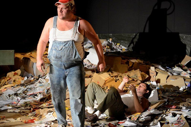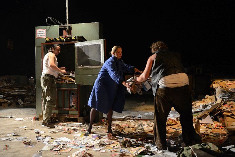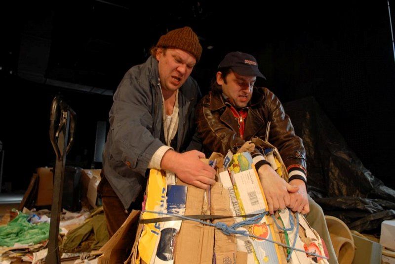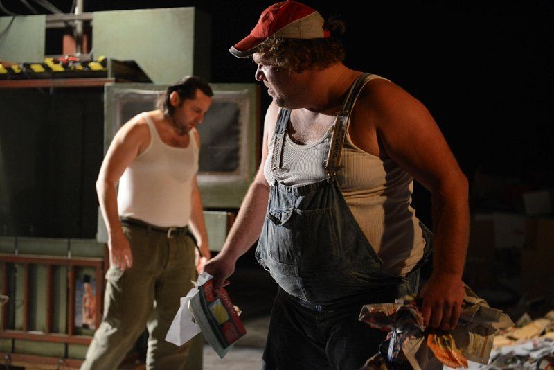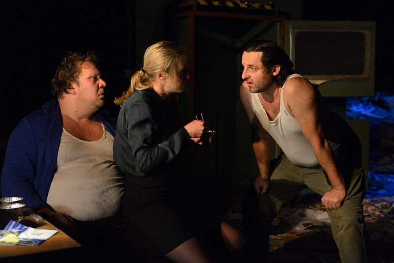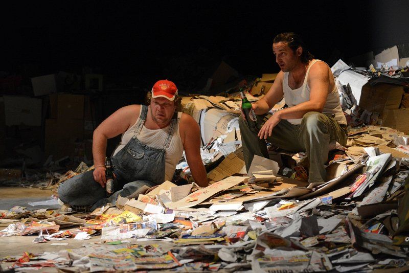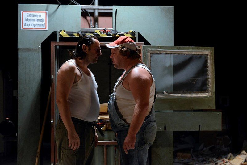 Hipernaturalističnih gledaliških uprizoritev je pri nas malo in še tiste redke so praviloma omejene na monologe ali dialoge. Teza, da tovrstna produkcija nima omembe vrednih kvalitet v primerjavi s formalističnim, poetskim absurdnim ali epskim gledališčem, pri nas še vedno prevladuje. Predstava Vdovin zmenek na slepo je skrajni primer naturalizma, brez vsakršnega posega, ki bi vsaj nakazoval elemente stilizirane, distancirane, potujene ali stopnjevane razsežnosti dogajanja, edini manjkajoči člen do popolne iluzije realnosti bi bila izvedba izven gledališkega prostora. V kakšni tovarniški hali torej, čeprav ta potencialni manko povsem ustrezno nadomesti scenografija Branka Hojnika, ki je hiperveristična podoba balirnice, torej obrata za obdelavo papirja, vključno z gorami časopisov in čisto pravo stiskalnico. Skladna s tem sta prevod in dramaturgija (Eva Mahkovic), ki besedilo Israela Horovvitza transformirata v povsem poslovenjeno atmosfero, vključno z glasbeno kuliso, ki še potencira raster domačega ruralno-proletarskega okolja. Predstavi dajeta popoln naturalistični značaj igralca Primož Pirnat in Gorazd Jakomini. Na prvi pogled se zdi njuna realizacija likov še najbolj podobna igri naturščikov, torej povsem spontan govor, gestikulacija ter gibi in obvladovanje prostora, če k temu prištejemo temeljni modus njune pojavnosti ter prepričljivih verbalnih in fizičnih konfliktov, se ustvarja že videz dokumentarne projekcije. Ženejo ju primarni nagoni, občasno skriti za nereflektirana in navidezna, nikoli povsem sprejeta načela formalne kultiviranosti, vendar je že najmanjši incident dovolj, da prvinska, skoraj animalična čustva in reakcije planejo na dan. Poglavitni vir osrednjega konflikta je seveda prihod mlade vdove Marte (Helena Peršuh), kjer se ta animalična čustva razvijejo v vseh razsežnostih, nobena »civilizacijska« norma jih ne more ublažiti, kaj šele preprečiti. Vprašanje moške nadvlade je postavljeno izključno na fizično raven, saj je moški (vsaj v primeru te dramske predloge) racionalno in emocionalno inferioren, ta svoj primanjkljaj pa poskuša kompenzirati z najbolj brutalnimi sredstvi, vključno s posilstvom. To seveda ne simbolizira samo telesne zlorabe, temveč diskreditacije celotne osebnosti, s čimer ta predstava ob analiziranju odnosa moški-ženska dobiva tudi socialne in ne nazadnje razredne komponente. Vendar je tukaj malo moraliziranja, patosa in sočutja, vse se odvrti po nekakšni perverzni fatalni notranji logiki, M ji ni mogoče ubežati. Režiser IgorSamobor tukaj skrajnega naturalizma ne uporabi kot pripomoček za preskok v derealizacijo (najnižji družbeni sloji oziroma njihov trk z bolj sofisticiranimi osebki), se ne tretira kot nekaj eksotičnega, kar pač privlači občinstvo, temveč ga realizira v goli pojavnosti. Banalnost in trivialnost eksistence obstajata tukaj in zdaj, nič ju ni treba dekorirati z imaginativnimi zapleti, umetno konstruirano konverzacijo ali dramatičnimi razpleti, bolj kot linearno je izpostavljeno ciklično dogajanje, ki se vpetih tisočletjih pravzaprav ni prav veliko spremenilo.