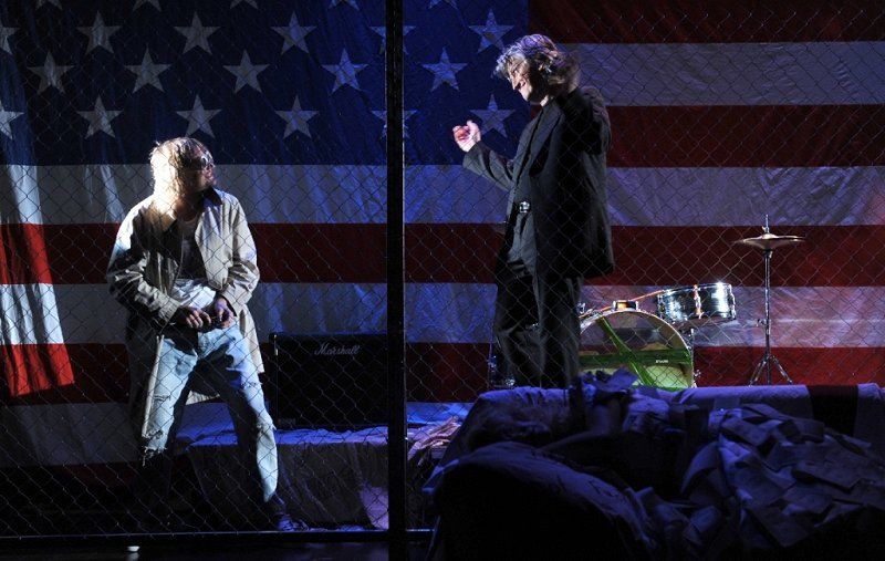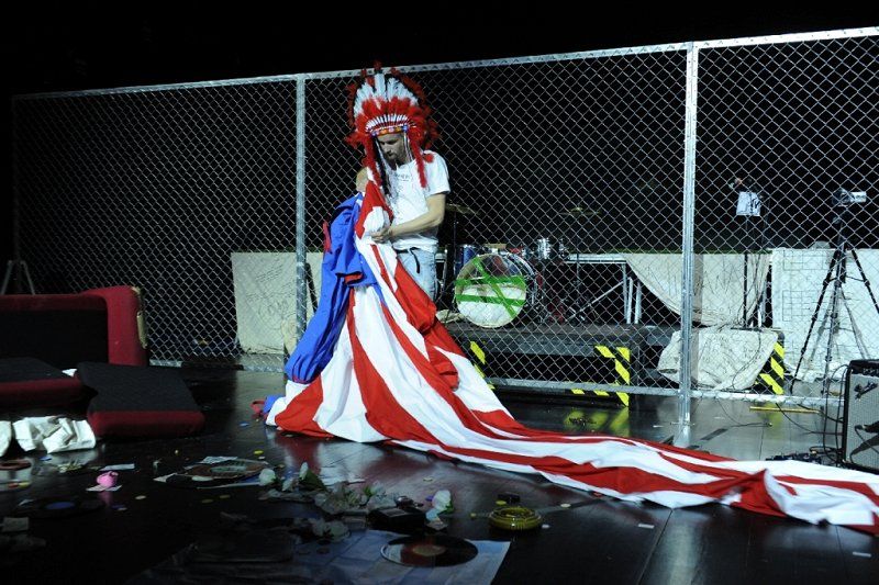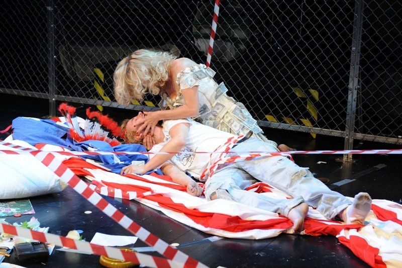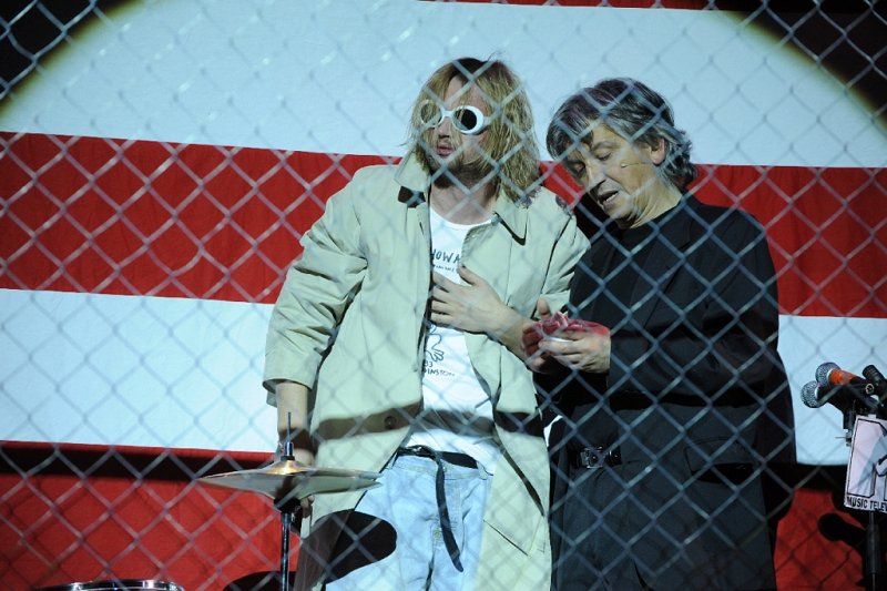 /…/ V splošnem pogovornem in diskretno slengovsko niansiranem prevodu Gregorja Fona (lektor je bil Srečko Fišer) je slovensko praizvedbo drame posameznika v globalizirani kapitalistični družbi ob zanesljivem dramaturškem sodelovanju Martine Mrhar pregledno in s tankočutnim postopnim oblikovanjem vse bolj kaotičnega, medčloveško in medijsko odtujenega ter sprevrženo neprijaznega okolja zvezdnikovega življenjskega propada (s temno-jedko stilizacijo protagonista kot novodobnega Kristusa v svetu brezčutno parazitskih lastnikov in oprod industrije zabavljaštva) postavil na oder režiser Luka Martin Škof. Tragični konec slovitega alternativnega rock zvezdnika, ki je šele s svojim bednim životarjenjem in končnim samouničenjem postal mit oziroma pop ikona ter s tem dodaten vir zaslužka za brezmejno pohlepne lastnike kapitala, je sam po sebi obtožujoča prispodoba brutalno odkrite, neženirano zvodniške, polaščevalske in zločinske politike lastnikov in upravljavcev svetovnega šov biznisa, katere tako rekoč nujne in samoumevne žrtve najbolj etično zavrženih zlorab so tako vedno novi umetniki kot njihovo vedno novo občinstvo. Za nerealistično in večpomensko prizorišče pred in za veliko ameriško zastavo, na različnih ravneh in po vsej površini namerno preobloženo s simbolnimi prvinami, vsakdanjimi kosi pohištva in rekviziti iz življenja pop zvezdnika ter pomensko »razširjeno« z množico televizijskih in projekcijskih zaslonov, na katerih so se prepletale računalniške podobe, projekcije videov in neposrednih televizijskih prenosov dogajanja na prizorišču, je premišljeno poskrbel scenograf Miha Knific. Ponekod časovno, socialno in generacijsko pomenljivo ter drugod domišljijsko in simbolno stilizirano kostumografijo je dodala Nadja Bedjanič. Skrbno premišljeno in učinkovito uporabljeno izvirno glasbeno in zvočno podporo dogajanju je prispeval avtor glasbe Matej Končan Kleemar. Nosilno vlogo notranje bolestno preobčutljivega, z modnimi in minljivimi življenjskimi nadomestki zasvojenega ter kljub globlji jasnovidnosti nemočnega upornika ter zavestno samožrtvujočega se pop zvezdnika Kurta Cobaina – z življenjskim vodilom: Boljše zgoreti kot zbledeti! – je s široko pahljačo igralskih in interpretacijskih izrazil prepričljivo oživil in človeško posplošil Kristijan Guček. Notranjo neubranost in nezanesljivost njegove nezveste žene in konkurentke na nebu popularne kulture Courtney Love je jasno, notranje konfliktno in ostro izrisala Helena Peršuh. Opolzko brezčutno sprevrženost zlodejsko manipulativnih oblastnikov in posrednikov iz sveta pop industrije, vselej na koncu zmagovitih in vedno »čistih rok«, sta jedko izloščila Iztok Mlakar kot Pete in Ivo Barišič kot Barrij. Predstavnika naivno nekritičnih žrtev pop idolov, ki so pripravljeni za »sveti« trenutek bližine s svojim »božanstvom« zastaviti tako dušo kot telo in vse življenje, sta oživila Maruša Kink kot umorjena Kelly in Blaž Valič kot Louis. Za maskami je sodeloval Vladimir Hmeljak.