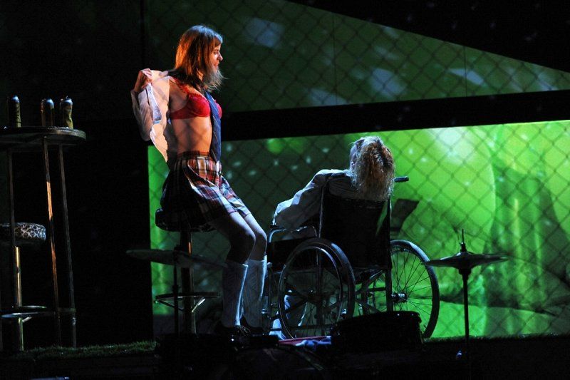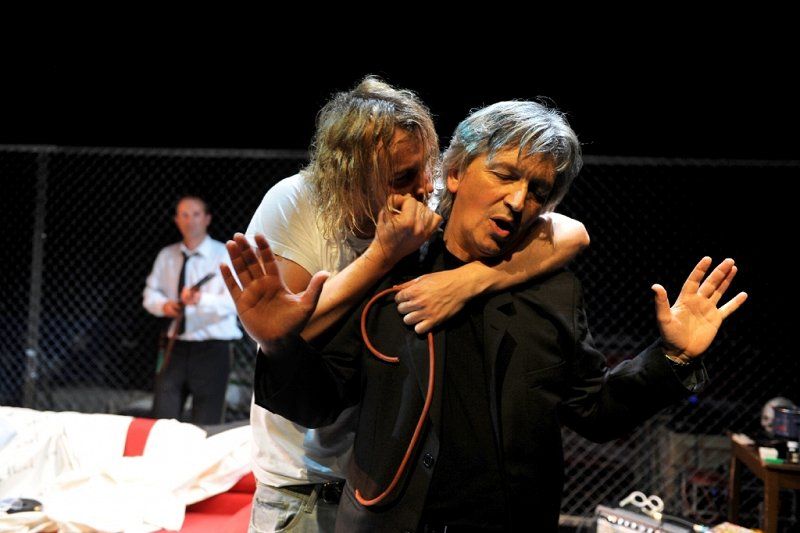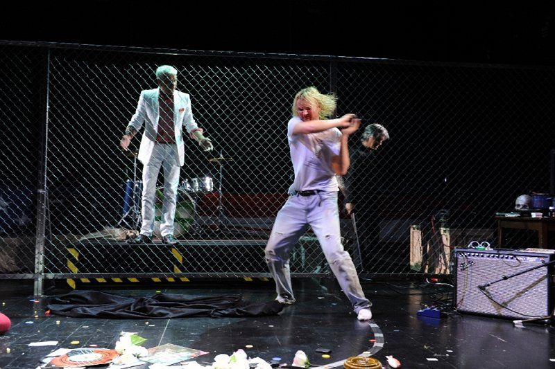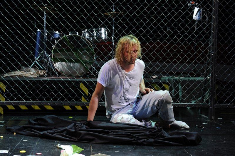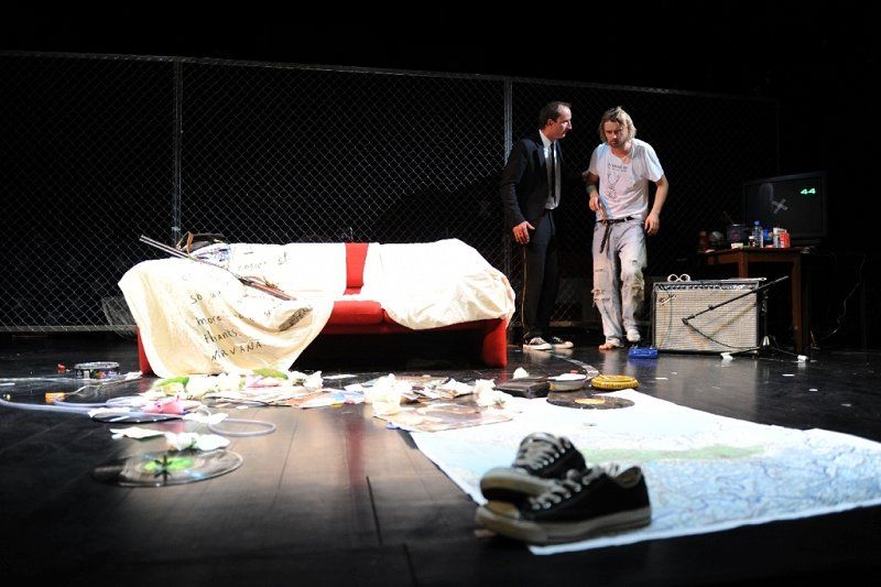 Najprej nas preseneti odrski prostor, scenograf je Miha Knific, ki je poenoten, imamo sicer sprednji del in plezanje čez ograjo, kar sugerira pobeg, in zadnji, ki spominja na ring in v katerem se odvijejo prizori iz hotelske sobe z oboževalko in nekaj replik s producenti, lastniki diskografskih hiš. Predvsem so režijsko okvirni prizori in nekakšen Kurtov dom daleč od tistega, kar si predstavljamo kot življenjski stil rock zvezde; nastlana mizica, na kateri na kuhalničku kuha špagete in jih poje iz medicinske »ledvičke«, kavč, vse je nepospravljeno, nametano, kot bi šlo za prostor obstrancev, džankijev nižjega ranga. Vendar ta verizem, grobost, spust na raven slehernika, kar podčrtuje tudi kostumografija Nadje Bedjanič, sugerira določeno surovost, neposrednost, tudi marginalnost, Kurta postavlja v opozicijo etsteblišmentu in urejenosti in v vlogo nemoči; ne samo nasproti lastni odvisnosti, še bolj proti modelom iz industrije zabave. To isto surovost opazimo potem pri zvoku, predvsem v prvem delu, čeprav ozvočeni, delujejo glasovi igralcev in glasba kot iz vatastega, s kopreno pridušenega prostora; nalašč nečisto, zabrisano, s tem kot da avtentično, še posebej vizavi formalno izbrušenim in tehnično perfektnim izdelkom našega časa; izdelkom, ki s svojo spolirano povrhnjico prikrivajo odsotnost naboja, vsebine. Avtor glasbe je Matej Končan Kleemar. Še posebej udaren je kao bootleg posnetek Kurta na kitari, ne vem, ali gre za ready made ali ponaredek, repetitivna zanka obupanega odpuljenca, zaprtega v svojem svetu, vendar ne brez sentimenta in neke posebne in skoraj srhljive nežnosti. Hkrati ta izvedbena surovost sugerira ravno delirantno, halucinantno naravo odrskega dogajanja. Manj morda razumemo množenje prizorišča z uporabo videa; na monitorjih ob strani in na horizontu so predvajani simultano nasneti detajli iz predstave, vendar v svoji zamegljenosti – sedel sem v zadnji vrsti – delujejo izključno vizualno, kot gibljiv in fluiden dodatek ostalim scenografskim elementom.