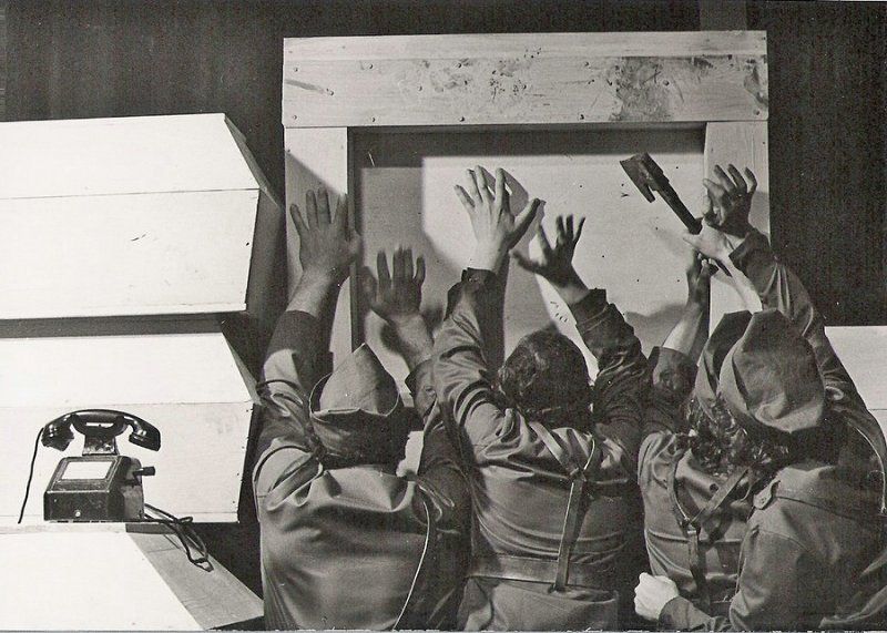 Ta se je režiserju Emilu Aberšku pokazala bolj kot zaporedje situacij, v katere so postavljeni vojaki v ogroženi kaverni, kot individualna zgodba sprtih in po ženski ločenih bratov, situacij, ki jih razvoj te zgodbe seveda opredeljuje, ki pa jo večkrat prerasejo in prekrijejo. To so situacije, ki koreninijo v nenehni smrtni nevarnosti Bevkovih soldatov, so različne manifestacije strahu pred smrtjo, kot jih pač izzovejo dražljaji od zunaj: tesnoba, panika, napadalnost, histerija; Aberšek je nekatere med njimi učinkovito prevedel v odrski jezik, poudarjana neenotnost besedila pa je bila najbrž vzrok, da jih je včasih zaokrožil in ločeval nasilno, z manj prepričljivimi pomagali, kot je na primer igranje na ustno harmoniko, še bolj pa docela neumestno poleganje mrtvega brata v krsti na odru.