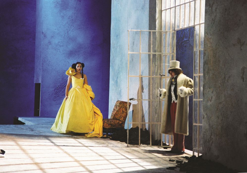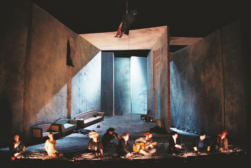 Tako kot liki le z osnovnimi, a zato toliko bolj predimenzioniranimi lastnostmi, je tudi scena okleščena realističnega balasta. Ostale so zgolj ogromne sive in v nebo vpijoče stene, pod katerimi so ljudje komajda še bedne kreature, ki z življenjsko vitalnostjo nimajo nič več skupnega. Enako je z jezikom, saj je odrezav, nadut, potvorjen, suh in na trenutke že povsem enak zvenu absurdne dramatike.